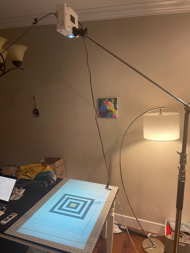 Recently, I discovered the concept of using a projector in your sewing. The idea is simple, you project your pattern into a cutting mat, and using a rotary cutter – trace the pattern on the mat – either directly to your fabric or to a paper. Sounds incredible!